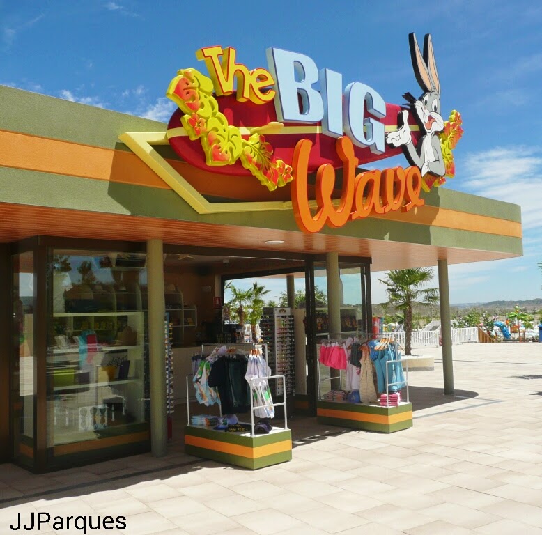 Al entrar en el parque descubrimos la tienda más grande y la única de este llamada "The Big Wave - La Gran Ola", en ella encontramos camisetas, bañadores, chanclas y todo tipo de merchandising del parque así como una amplia gama de productos de los personajes del parque. Además en esta efectuamos el pago del alquiler de toallas y consignas, por las cuales debemos dejar 10 € de fianza. Una tienda ideal para llevarnos un recuerdo del parque, eso sí, los precios de los productos de esta, son un poco caros, como los del parque en general. Comenzamos a disfrutar de las atracciones del parque.